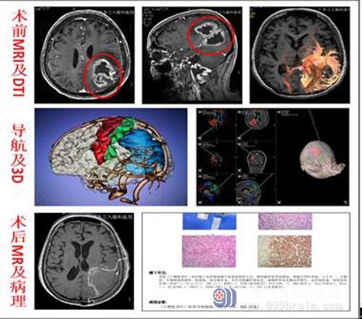 直到母亲出现讲话不清、胡言乱语,儿子这才将她送到到广东三九脑科医院综合神经外科。头颅核磁共振检查提示:1.左侧顶枕叶占位性病变,范围约为5.7cm×4.1cm×6.6cm,考虑为胶质母细胞瘤可能;2.颅内可疑软脑膜异常强化待排脑脊液播散转移;3. DTT(白质纤维束三维重建)检查:左侧顶枕叶病变区纤维束显影杂乱,部分纤维束中断;左侧皮质脊髓束显影偏细,左侧额枕束显示短小,胼胝体束体部纤维束稍稀疏。