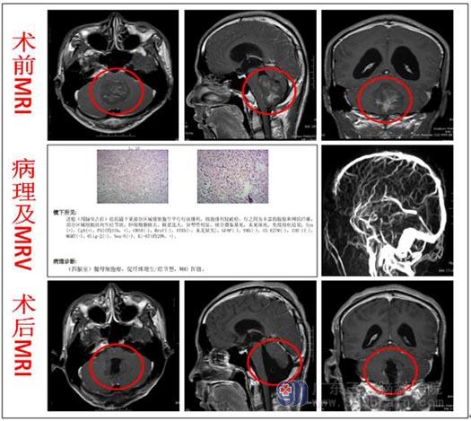 排除手术禁忌症后,由鲁明副院长主刀,在全麻下行“四脑室巨大占位性病变切除术”,术中见肿瘤质脆、硬混杂,边界相对尚清,与周围粘连紧密,小脑被压向两侧,向下挤压脑干,瘤内有卒中,血供中等,显微镜下予以分块全切除肿瘤,手术顺利。术后病理:髓母细胞瘤,WHO IV级。