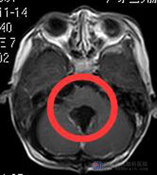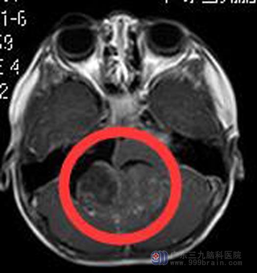 广东三九脑科医院头颅MR检查提示:小脑蚓部一团块状占位性病变,大小约5.7cm×5.4cm×4.2cm,小脑扁桃体受累并变尖,下端呈舌状,向下疝入椎管内,达C2水平;延髓受压前移。