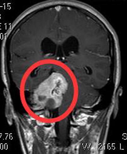 进一步头颅MR检查提示:右侧桥小脑角区囊实性占位性病变,大小约3.58cm×3.79cm×4.91cm,脑干及右侧桥臂受压变形。四脑室受压变窄,幕上脑室系统轻度扩张,考虑为听神经瘤。