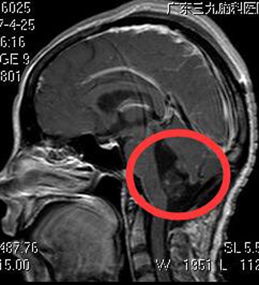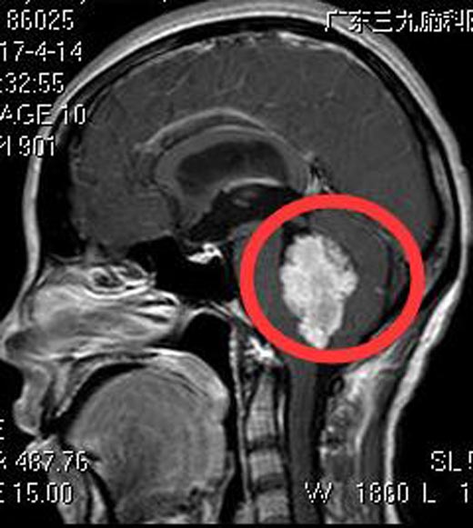为明确原因,在当地医院行头颅CT检查,提示:四脑室占位,并梗阻性脑积水。急诊行脑室外引流,术后转入广东三九脑科医院神经外五科。头颅MR检查提示:四脑室巨大占位性病变,大小约3.8cm×4.8cm×3.3cm,考虑为室管膜瘤可能性大。