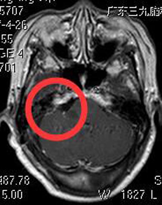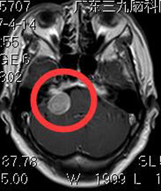 入住广东三九脑科医院综合神经外科,进一步头颅MR检查,显示:右侧桥小脑角占位性病变,大小约2.6cm×2.0cm×2.5cm,考虑听神经瘤。