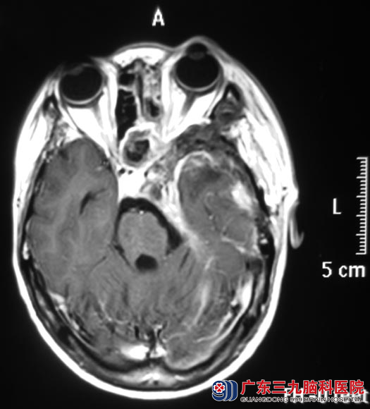 吴女士2年前出现左侧颜面部麻木感、如蚂蚁爬行感;一周前突然出现视物重影,伴头痛头晕,当地医院头颅CT显示:左侧中后颅窝巨大占位。广东三九脑科医院头颅MR检查提示:左侧中、后颅窝颅内外区示一巨大占位病灶,大小约77.5mm×70.8mm×45.2mm,累及左侧颞下窝及翼腭窝、左侧颞部,向前向下突入上颌窦内,向内突入蝶鞍、蝶窦、筛窦内,左侧眶尖受累,向后突破岩尖伸入后颅窝左侧桥小脑角区,邻近脑干明显受压变形、移位,四脑室变形、稍变窄。CT提示相应骨质呈膨胀性的吸收破坏。
