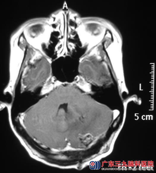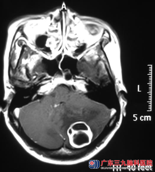 广东三九脑科医院头颅MR检查提示:左侧小脑半球囊性病灶,大小约28.3mm×28.3mm×23.5mm。