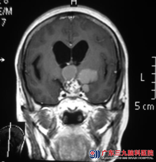 头颅MR检查提示:鞍上与鞍旁左侧示一不规则形状囊实性占位性病变,大小约45.5mm×32.1mm×35.8mm,考虑颅咽管瘤,中度脑积水。