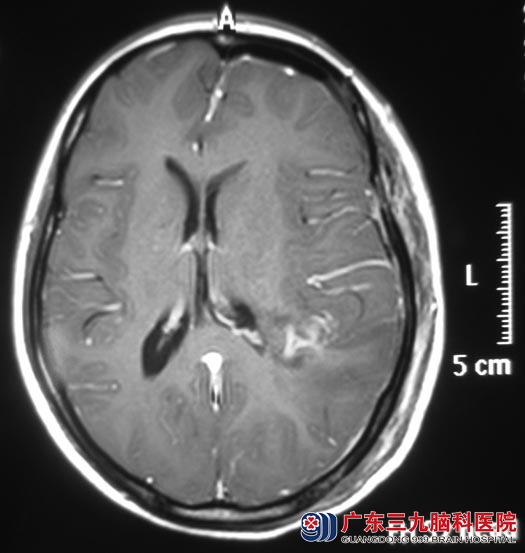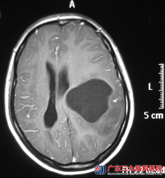 CT检查提示:左侧额顶叶囊实性占位;广东三九脑科医院头颅MR检查提示:左侧额顶叶示一较大的囊实性占位性病变影,病变实性部分边界不清,囊性不稳边界清楚,大小约为67.3mm×65.2mm×64.8mm,脑干明显受压,左侧环池变窄。