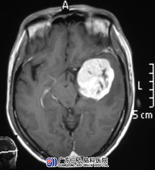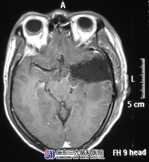 家人为了弄个明白,带着他去医院,头颅MR检查提示:左侧颞叶巨大占位性病变。