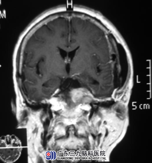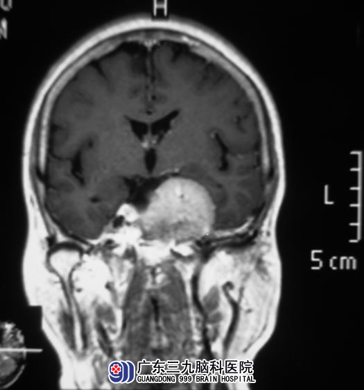 广东三九脑科医院MR检查提示:左侧岩斜区示一不规则形实质性占位性病变,大小约为46.2mm×33.5mm×34.0mm,病变向上生长挤压视交叉,侵犯左侧海绵窦,并突破鞍隔长入鞍内。综合神经外科 鲁明主任初步考虑为脑膜瘤。