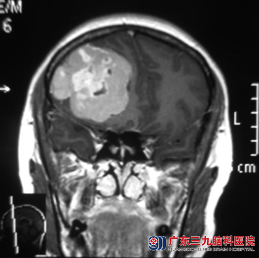 涂女士八天前出现右侧头顶部蚂蚁搔爬般痛,伴恶心呕吐,休息无好转。当地医院头颅CT检查提示右侧额颞叶占位性病变,性质待查。广东三九脑科医院头颅MR检查:右侧额部示不规则块状占位性病变,大小约6.0cm×4.5cm×6.5cm。