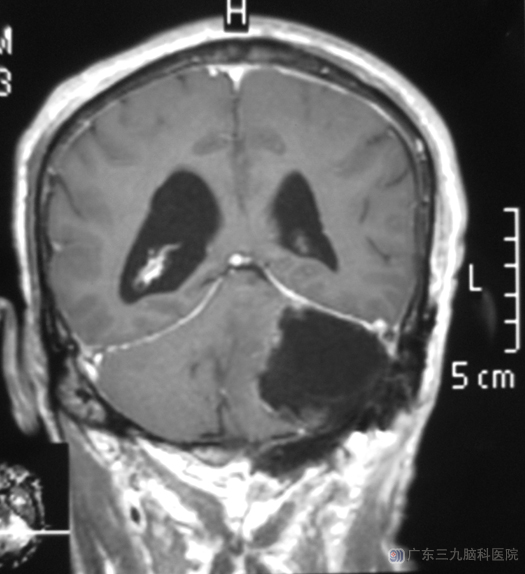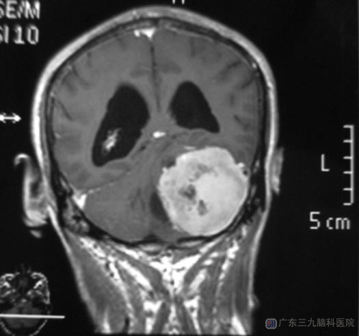 一周前,荣先生感觉走路明显乏力伴不稳,当地医院行头颅CT检查提示:左侧桥小脑角占位、梗阻性脑积水。家人陪着他来到了广东三九脑科医院,头颅MR检查提示:肿瘤大小约47.5mm×58.1mm×60.5mm,脑干及左侧小脑半球受压,小脑扁桃体下疝,初步考虑脑膜瘤。http://www.999brain.com/
