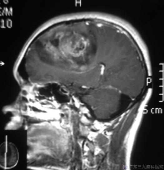一个月前他出现头晕头痛,以头顶部为主,持续约1小时后可自行缓解;一周前双手出现不自主地抖动,每次持续约2分钟左右。当地医院头颅CT检查:右侧额叶占位。广东三九脑科医院头颅MR提示:右侧额叶示一巨大不规则形占位性病变,大小约79.0mm×73.2mm×69.4mm,中线结构向左偏,中脑受压变形。