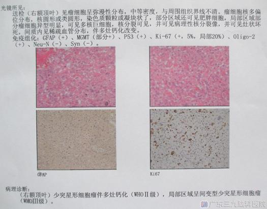 由综合神经外科鲁明主任主刀,在术中唤醒麻醉下行右侧额叶巨大占位切除术。术前导航定位,显微镜下见红色肿瘤组织,与周围正常脑组织分界尚清;分离分块切除肿瘤组织,予超声吸引器将肿瘤全切。术后小陈的语言、肢体活动均正常。病理结果:少突星形细胞瘤伴多灶钙化(WHO II 级),局部区域呈间变型少突星形细胞瘤(WHO III级)。后期小陈还需接受进一步的放射治疗。