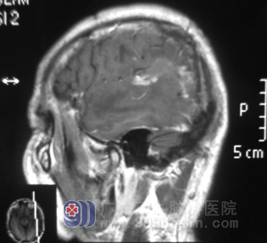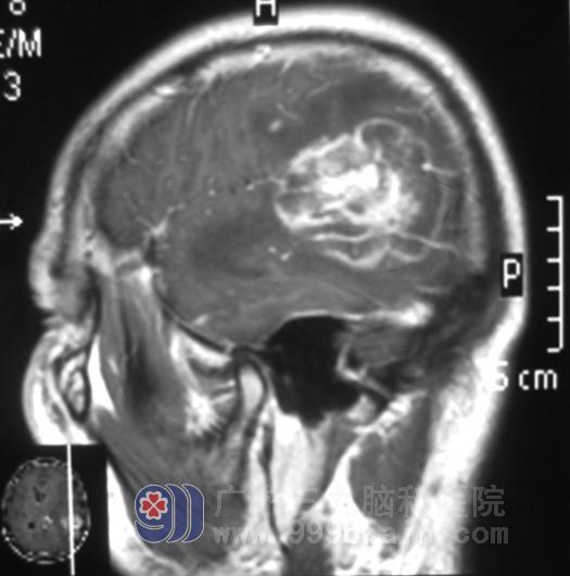 在朋友的建议下,他父亲带着影像检查资料,找到广东三九脑科医院综合神经外科鲁明主任。鲁主任综合几方面考虑有两种可能:一是肿瘤性病变,二是炎性的病变。从我院MRI影像学分析:左侧颞叶占位明确,周围水肿明显,大小为5.5cm×6.1cm×3.1cm,左侧脑室受压变形,患者头痛症状严重并伴恶心,首选手术治疗。
