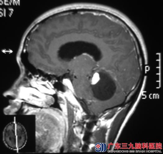 广东三九脑科医院MR检查提示:右侧小脑半球占位性病变,以囊性为主,增强明显,考虑血管母细胞瘤的可能性大。