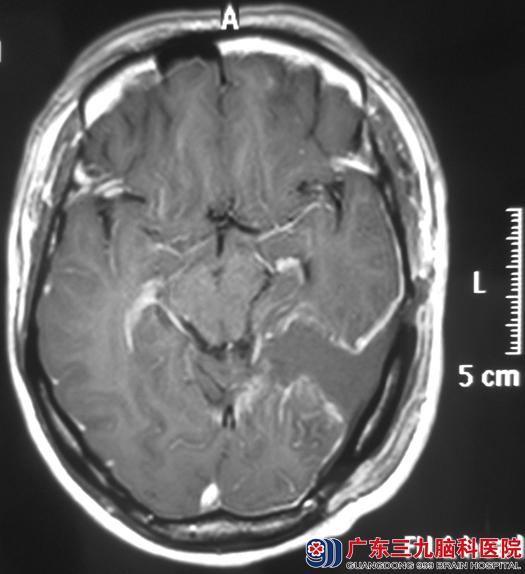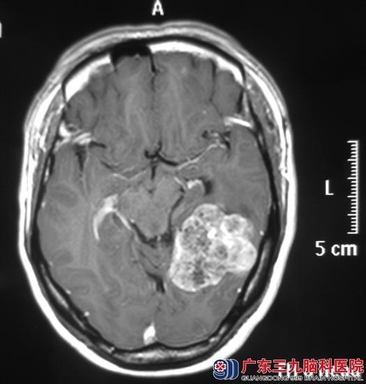 广东三九脑科医院头颅MR检查提示左侧颞枕部一不规则分叶病灶,大小约45.8mm×46.9mm×29.4mm。综合神经外科鲁明主任凭借多年的临床经验初步判断是脑膜瘤的可能性大。