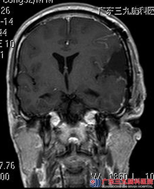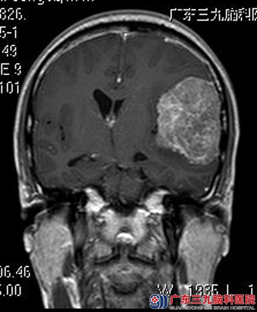 在亲属的陪同下,他们来到广东三九脑科医院。头颅MRI检查显示:左侧额颞部占位性病变,大小约6.9cm×3.9cm×6.2cm,考虑脑膜瘤。