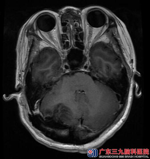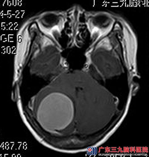 为进一步查找原因,她来到了广东三九脑科医院。头颅MRI检查提示:后颅窝右侧小脑半球区示一类圆形的占位性病变,大小约4.3cm×4.7cm×4.5cm,病变上缘与后缘紧贴邻近硬脑膜,邻近脑组织受压明显移位,考虑脑膜瘤可能性大。