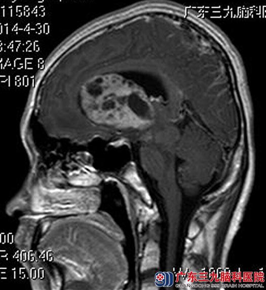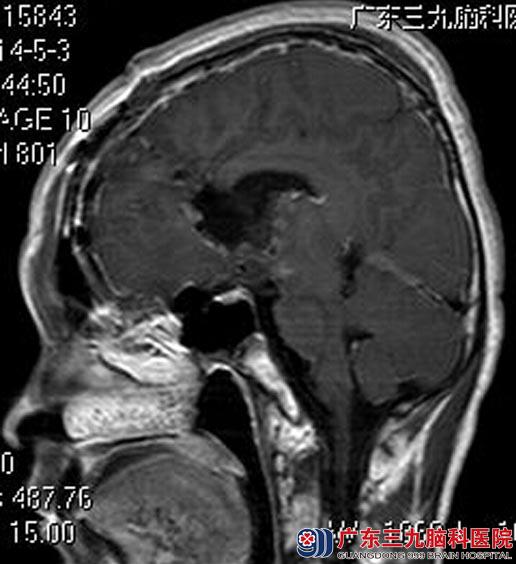 “才头痛一周时间而已,怎么就长肿瘤了?”父母将信将疑地带着小杨来到广东三九脑科医院。头颅MRI检查提示:左侧基底节区示一团块状占位病灶,累及脑桥左侧、中脑左侧,病灶范围约48.0mm×59.6mm×39.3mm,占位效应明显,左侧侧脑室受压,中线结构明显右偏。幕上脑室系统明显扩大,并周围间质性水肿信号,考虑生殖细胞瘤可能性大。