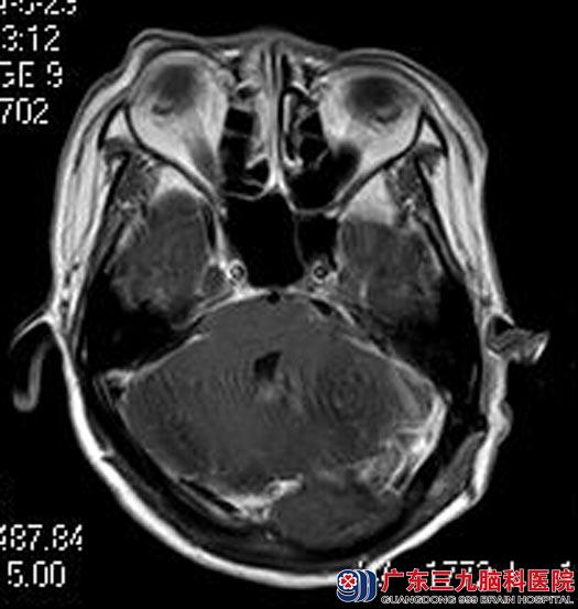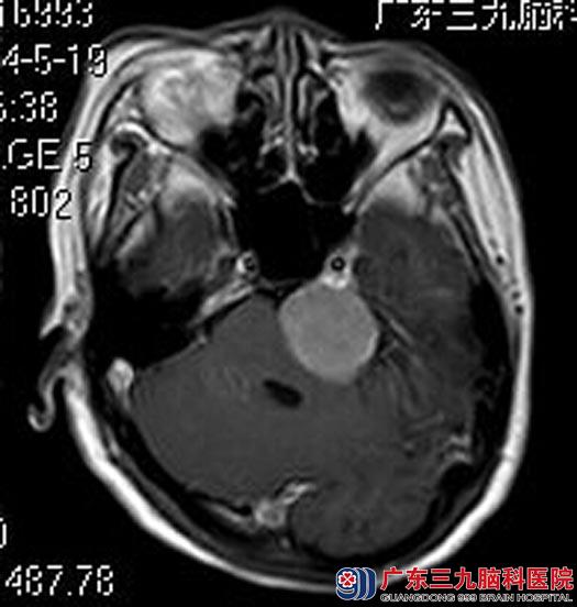 广东三九脑科医院进一步MR检查提示:左侧桥小脑角区一团块状占位性病变,大小约3.45cm×2.62cm×3.38cm,脑干及四脑室受压、变窄。