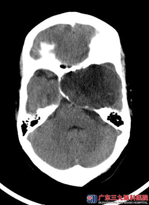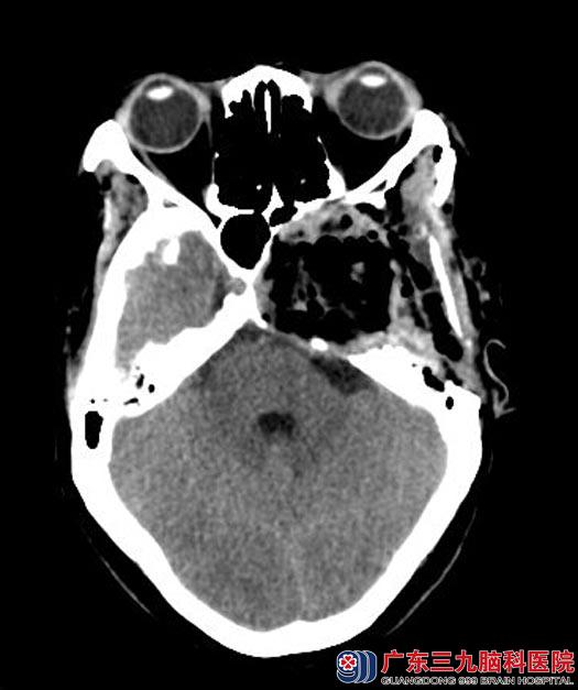 广东三九脑科医院神经外五科鲁明主任建议行头颅CTA检查进一步了解肿瘤血供情况,结果提示:左侧中颅窝示一卵圆形囊实性占位性病变,大小约69.4mm×51.9mm×63.9mm,其内可见多条小血管走行,邻近颅骨受压变薄,左侧颈内动脉受压变形并向右移位,左侧大脑中动脉受压向上、向前移位。