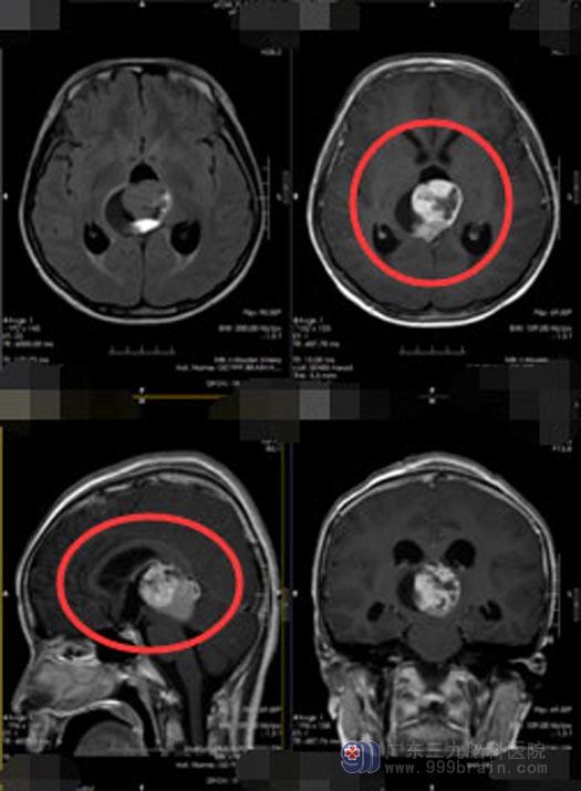 近一个月来,小韩的精神状态越来越差,反应迟钝伴肢体乏力,逐渐发展为不能行走。父母这才开始着急。当地医院头颅MR提示:松果体区占位,伴梗阻性脑积水。医生说:松果体区最常见的肿瘤是生殖细胞瘤,75%的为恶性肿瘤,压迫了脑脊液的循坏通路导致脑积水,就诊时几乎所有患者都会出现典型的脑积水症状和体征:头痛、呕吐、嗜睡、记忆障碍,瘤体较大的患者还可出现耳鸣、听力障碍和步态不稳、共济失调、眼球水平震颤等,如果脱落的肿瘤细胞沿脑脊液播散,还可累及神经根和脊髓;由于松果体区肿瘤位置深在,周围有重要的神经和血管,多年来一直被神经外科医师视为难度大的手术之一。一家人一下子慌了神,他们明白,找对医院、找对专家对于孩子的治疗非常重要。