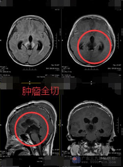 来到广东三九脑科医院神经外五科后,医院副院长、神经外五科主任建议小韩先放化疗再行手术。放化疗期间,小韩精神差,考虑和脑积水有关,急诊行‘脑室外引流术’。小韩术后精神好转,继续行放化疗。几天后他的病情再次加重,昏迷不醒。鲁明带领神经外五科医生团队立即给小韩行“右额纵裂-胼胝体-穹窿间入路行松果体区肿瘤切除术”,术中暴露肿瘤,见左侧视神经及颈内动脉被肿瘤压向前外方,与肿瘤粘连,明显变薄。分块切除肿瘤,肿瘤基底部起源于鞍膈,部分位于鞍上、部分位于鞍内,在显微镜下将肿瘤全切,视神经、视交叉、垂体、垂体柄等瘤周组织保护完好。