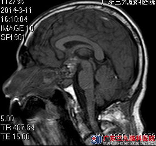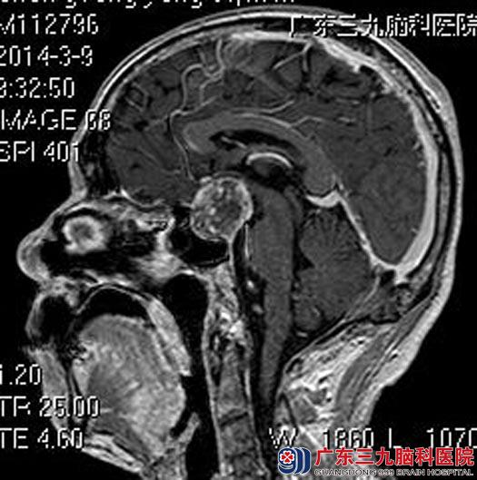 家属联系到广东三九脑科医院垂体瘤诊疗中心鲁明主任,建议进一步检查。头颅MR检查提示:鞍内及鞍上示一不规则信号影,大小约26.6mm×32.8mm×31.0mm,考虑垂体大腺瘤可能性大。