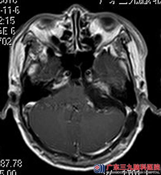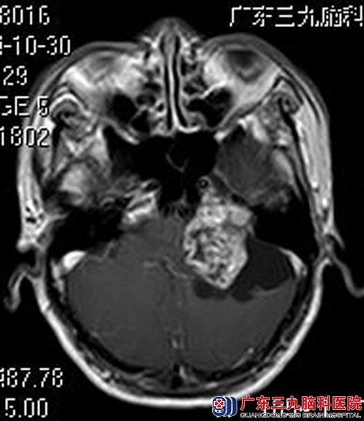 在广东三九脑科医院进一步MR检查发现:左侧桥小脑角一团块状囊实性占位性病变,大小约4.26×3.35×3.06cm,考虑听神经瘤可能性大。