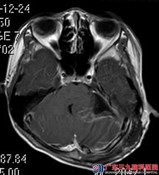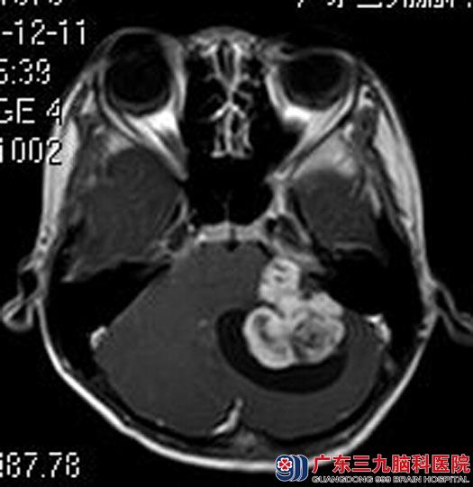 得知是脑瘤,小豪的父母不敢耽误,带着他来到广东三九脑科医院综合神经外科。进一步头颅MR检查:左侧桥小脑角区示囊实性占位病变,大小约32.3mm×39.3mm×33.6mm,考虑脑膜瘤可能性大。