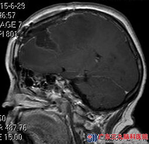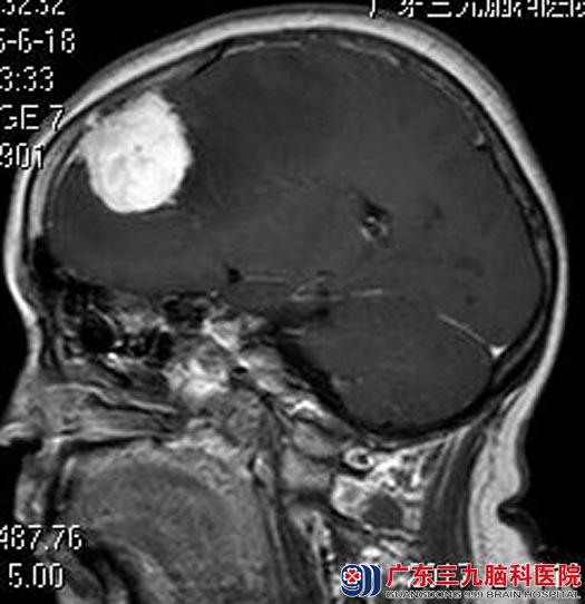 情急之下,一家人想到了广东三九脑科医院。进一步头颅MR检查提示:左侧额部大脑凸面示一团块状异常信号影,大小约37.9mm×37.2mm×38.9mm,增强后较均匀明显强化,并示脑膜尾征,内侧紧邻大脑镰,局部压迫上矢状窦,考虑左侧额部大脑凸面脑膜瘤可能,待排除血管外皮细胞瘤可能。
