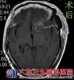 于是,曾阿姨一家人来到广东三九脑科医院,行头颅MR检查提示左侧额部示一团块状异常信号影,病变宽基底与前颅底相连,大小约4.87cmX3.87cmX2.70cm,邻近脑组织受压推移。左侧侧脑室受压明显变窄,中线结构向右偏移。完善相关检查后,由综合神经外科的鲁明主任主刀,在全麻下行左侧蝶骨嵴脑膜瘤切除术,术中显微镜下见灰白色肿瘤组织位于左侧鞍旁蝶骨嵴区,分块全切肿瘤,术中视神经、动眼神经、颈内动脉及其分支血管保护完好,手术顺利结束,术后患者未出现任何手术并发症,经系统治疗后康复出院。术后病理结果为:过渡型脑膜瘤(WHO I级)。