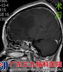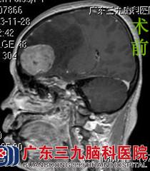 陈阿姨一家人来到广东三九脑科医院,行头颅MR检查提示右侧额部大脑镰旁示占位病变,大小约4.6cm×4.1cm×3.3cm,双侧脑室前角受压变窄,病变区域的中线结构明显向左侧偏移,鲁明主任考虑脑膜瘤可能性大。完善相关检查后,由鲁明主任主刀,在全麻下行右侧额部大脑镰旁脑膜瘤切除术,术中显微镜下见灰白色肿瘤,呈颗粒状,血供不丰富,质中,予肿瘤全切,手术顺利结束。术后经专科治疗护理,陈阿姨康复出院。术后病理结果:过渡型脑膜瘤。