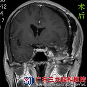 在朋友的帮助下,曾先生来到广东三九脑科医院综合神经外科鲁明主任处就诊,行头颅MR检查提示左侧鞍旁海绵窦、蝶骨嵴内侧巨大占位,大小约4.56cm*4.32cm*5.54cm。病变血供较丰富,左侧颈内动脉海绵窦段、左侧大脑中动脉受压上抬移位,与其关系密切。完善相关检查后,由鲁明主任主刀,在全麻下行左侧鞍旁海绵窦、蝶骨嵴内侧巨大脑膜瘤切除术,术中显微镜下见灰白色肿瘤位于左侧鞍旁蝶骨嵴区,向海绵窦内生长,质软,血供一般,边界清楚,予肿瘤切除,手术顺利结束。术后经治疗,患者康复出院。术后病理结果:过渡型脑膜瘤。