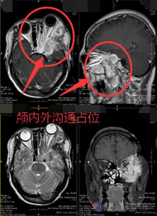 蔡阿姨因左眼突出伴颜面肿胀,1年前在外院行左颞部颅内外沟通脑膜瘤切除手术。去年 11月份再次出现左眼突出伴颜面肿胀、左眼无光感伴肿胀、轻微闭合不全。在之前的手术医院复查,MRI结果提示:脑膜瘤切除术后复发。