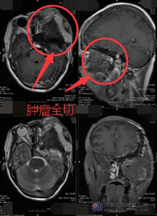 入住广东三九脑科医院神经外五科后,蔡阿姨进一步的检查结果显示:“左侧前中颅底及左侧颌面部颅内外沟通复发脑膜瘤”。