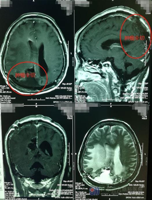 第三次手术,对手术医生的技术要求很高,医院副院长、神经外五科主任鲁明带领团队,凭着扎实的手术功底及多年的成功经验决定迎着困难上,在全麻下为钟姨行右顶枕镰窦复发脑膜瘤切除术。术中见上失状窦顶枕部闭塞,肿瘤起源于顶枕部大脑镰,主体位于右顶枕部,小部分肿瘤自大脑镰突入左侧枕部,肿瘤深部长入右侧脑室角,部分肿瘤侵入脑实质,右侧脑室角破损,予以修补、肿瘤全部切除;顶枕部受肿瘤侵袭的部分大脑镰以及长入上失状窦内的肿瘤也予以切除,闭塞的上失状窦前后段均予以妥善结扎。手术过程顺利,术中无重要血管及主要静脉窦损伤。