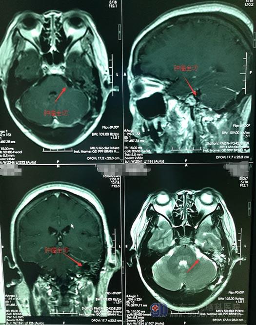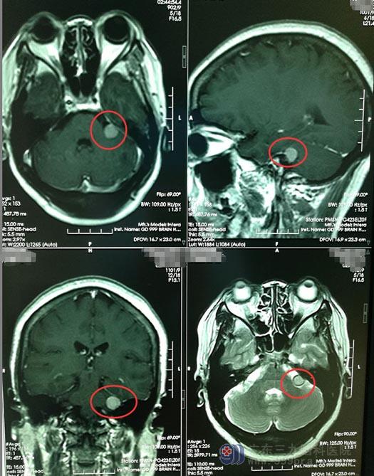 不久前,郑阿姨在家中打扫卫生时不慎撞到头部,当时就有头痛,立即到当地医院检查,头颅MR发现“左侧桥小脑角占位性病变,考虑脑膜瘤”。