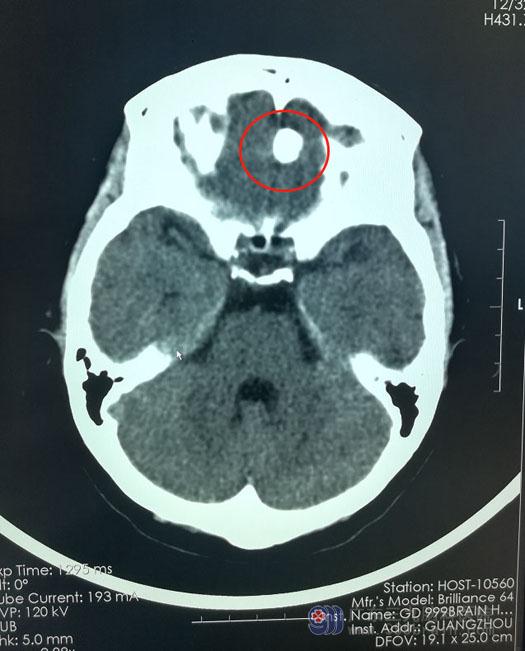 入住广东三九脑科医院神经外五科后,主管医生卢建侃为陈阿姨安排了相关的检查,颅脑MRI提示:前颅窝底左侧额部镰旁占位性病变,考虑钙化为主的脑膜瘤可能性大。