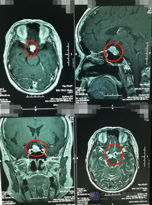 在热心同乡的介绍下,钟阿姨住进了广东三九脑科医院神经外五科。主管医生毕中胜安排她进行了相关的检查。MRI结果显示:鞍结节占位性病变,大小约12mm×13mm,考虑脑膜瘤可能性大。