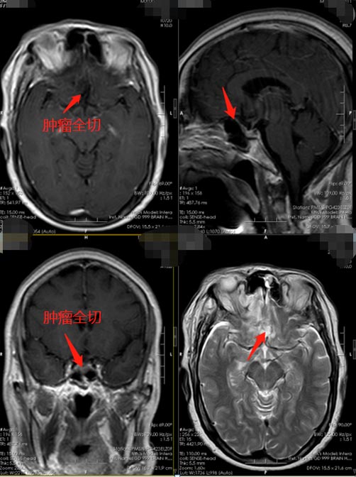 术中导航定位肿瘤后,于右侧眉弓中外2/3横切口,长约5cm,见肿瘤包裹双侧前动脉,大约2cm×2×cm1.5cm,予以仔细剥离,保护神经,肿瘤被分块完全切除。术后恢复顺利,第二天周阿姨即可下床活动,第四天办理了出院。病理诊断:脑膜瘤。
