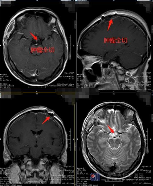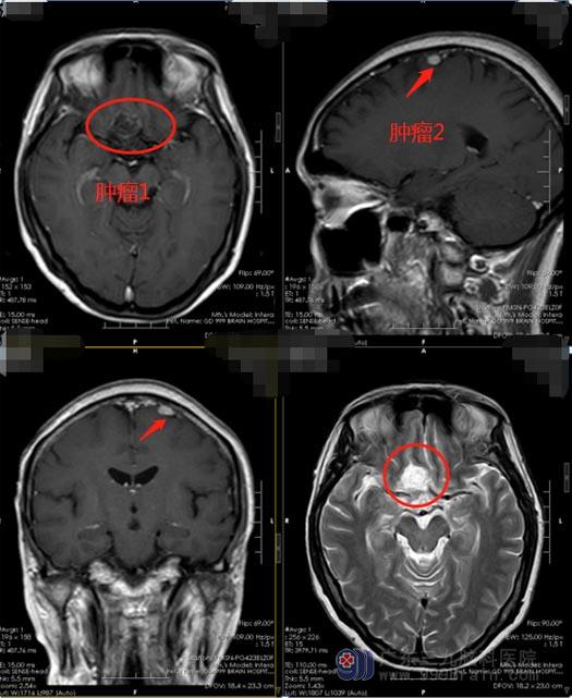 2周前,杨阿姨在当地医院体检,头部影像检查提示右侧额叶底部结节,考虑脑膜瘤或血管瘤,阿姨及家人一下子紧张起来。在广东三九脑科医院进一步头颅核磁共振检查发现:1.前颅窝底占位,考虑脑膜瘤;2.左侧额部占位,考虑小脑膜瘤。