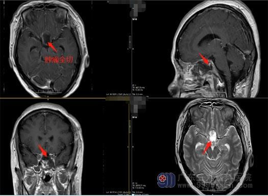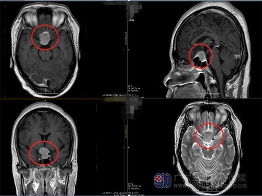 广东的陈阿姨,今年46岁。一个月前,她发现自己的右眼看东西模糊,并进行性地加重。一周前,陈阿姨的右眼彻底看不见东西了,同时伴有头痛症状,这才在家人的陪同下去当地医院做了检查,头颅MR显示鞍结节脑膜瘤。焦急的一家人寻到了广东三九脑科医院,入住神经外五科后,经过进一步的检查,陈阿姨被确诊为鞍结节脑膜瘤。