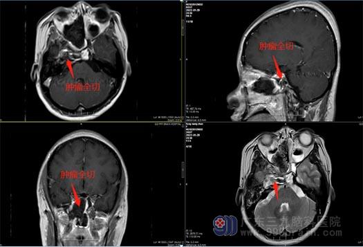最后一致决定采用“内镜辅助下经鼻行右侧鞍旁海绵窦内占位性病变切除术”,不用开颅,从鼻孔进入。内镜下见肿瘤呈灰白色,质软,全切肿瘤,手术顺利结束。术后,小方视物重影消失,未出现术后并发症,一周后满意出院。