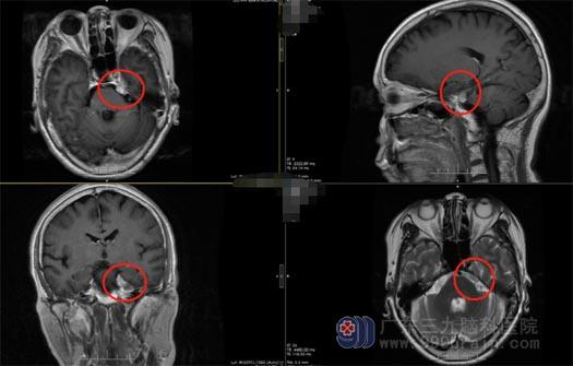 五年前,阿婆左侧下颌处开始频繁的出现放电样疼痛,有时候是进食,有时候是洗脸,有时候是刷牙,有时候甚至是吞口水都可以诱发疼痛。当时在附近医院就诊,查头颅CT示左侧岩斜占位,继发性三叉神经痛,当时未予以重视。当地医院给她开了口服卡马西平治疗,初期服用有效,但是慢慢的疼痛越来越频繁,口服药量也越来越大,但是缓解疼痛的作用越来越小,直到现在吃药几乎没有什么作用。直到得知广东三九脑科医院鲁明副院长擅长此类手术,所以下决心来广州求医。