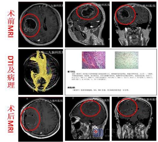 转至广东三九脑科医院综合神经外科,头颅MR提示:1.右侧额顶叶占位性病变,大小约4.8cm×5.9cm×4.7cm,考虑高级别胶质瘤,胶质母细胞瘤可能;2.右侧大脑镰下疝;3.双侧筛窦炎症;4.DTT(白质纤维束三维重建)检查,右侧额顶叶病变区纤维束中断、明显减少;右侧皮质脊髓束、胼胝体束右侧受压左移,右侧枕额束及右侧扣带束较对侧稀疏。因患者基础疾病多,待全面评估后再行手术治疗。