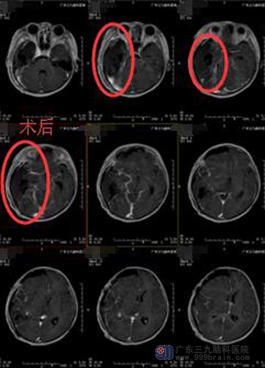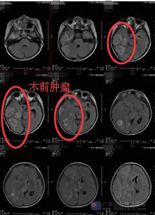 一周前她再次出现之前同样的症状,并且发作频率增多。入住广东三九脑科医院综合神经外科时精神状态较差,嗜睡,间断有呕吐,左侧中枢性面瘫。头颅MR及ASL检查结果:1.右侧颞叶多发占位性病变,并累及右侧基底节区、双侧丘脑及胼胝体膝部偏左侧;结合MRS检查考虑为恶性肿瘤性病变,并脑脊液播散转移,2.右侧大脑镰下疝形成;3.右侧上颌窦及筛窦炎症;4.双侧中耳乳突炎症。考虑恶性肿瘤,体积较大。