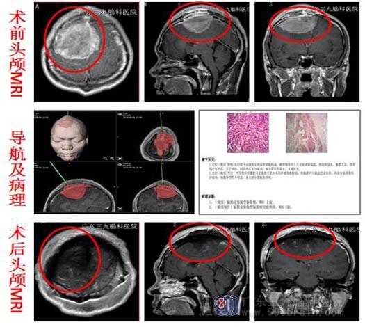 广东三九脑科医院进一步头颅MRI示:1.双侧额顶部(右侧为主)占位性病变,大小约7.3cm×6.8cm×5.3cm,考虑脑膜瘤可能;2.部分性空泡蝶鞍;3.MRV:病变邻近上矢状窦未见显影,相应浅表静脉稍增粗,考虑肿瘤压迫或侵犯所致。由于肿瘤巨大,血供丰富,且位于功能区,鲁明副院长建议尽早行手术治疗。
