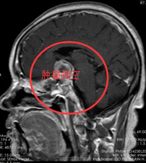 入住广东三九脑科医院垂体瘤诊疗中心,头颅MR提示:鞍区示团块状稍低、高混杂信号影,范围约3.7cm×2.6cm×2.4cm,垂体炳及视交叉显示不清,邻近双侧颈内动脉受压,左侧部分被包绕。