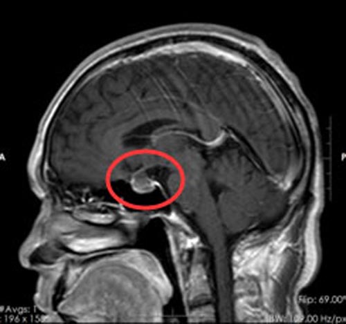 急诊行脑部MRI检查,鲁明副院长仔细阅片后,发现在头颅垂体的位置出现高信号,垂体前后叶间类圆形占位病变,大小约1.6cm×1.3cm×1.2cm,垂体柄受压前移,根据患者的一系表现和生化检查考虑是垂体卒中,脑垂体瘤腺瘤出血,压迫了视网膜及海绵窦内的动眼神经,导致动眼神经麻痹,视物重影。
