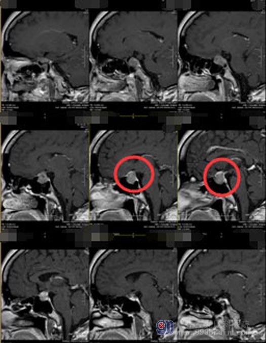 在广东三九脑科医院,赖女士的头颅MR检查结果提示:鞍内偏左侧-左侧海绵窦新增占位性病变,考虑垂体瘤复发伴卒中,病灶包绕左侧颈内动脉,压迫视交叉及左侧视神经颅内段。